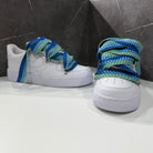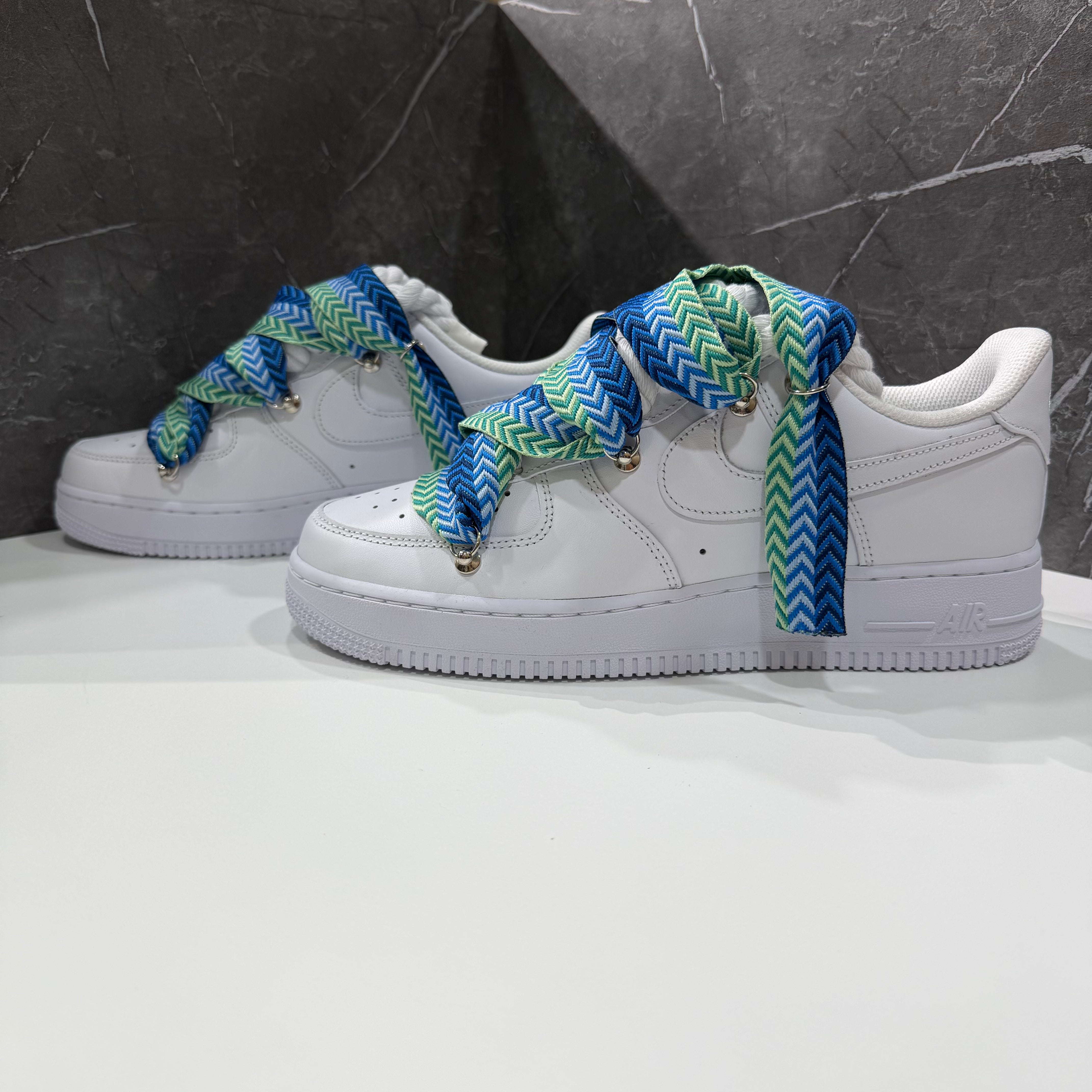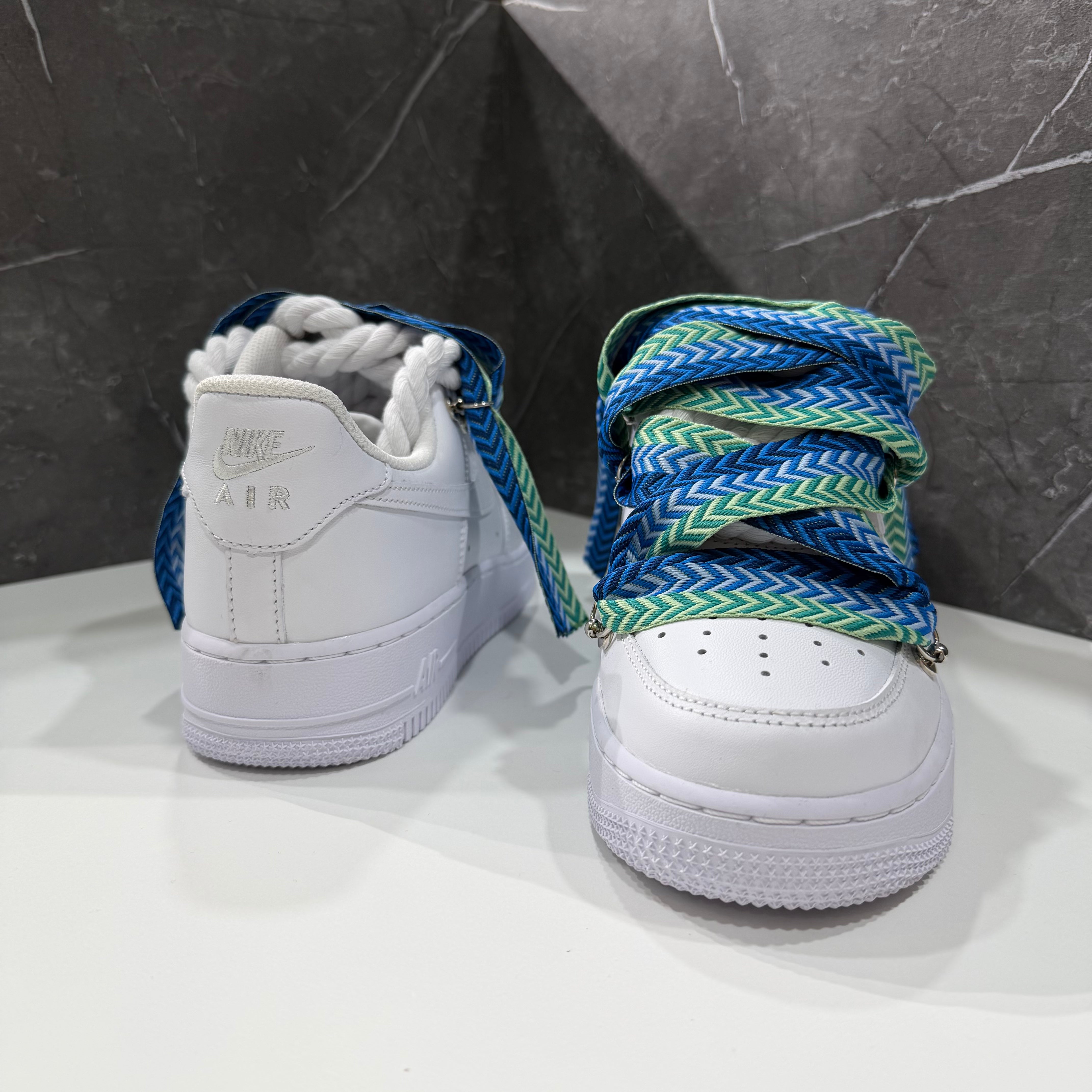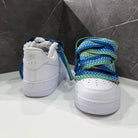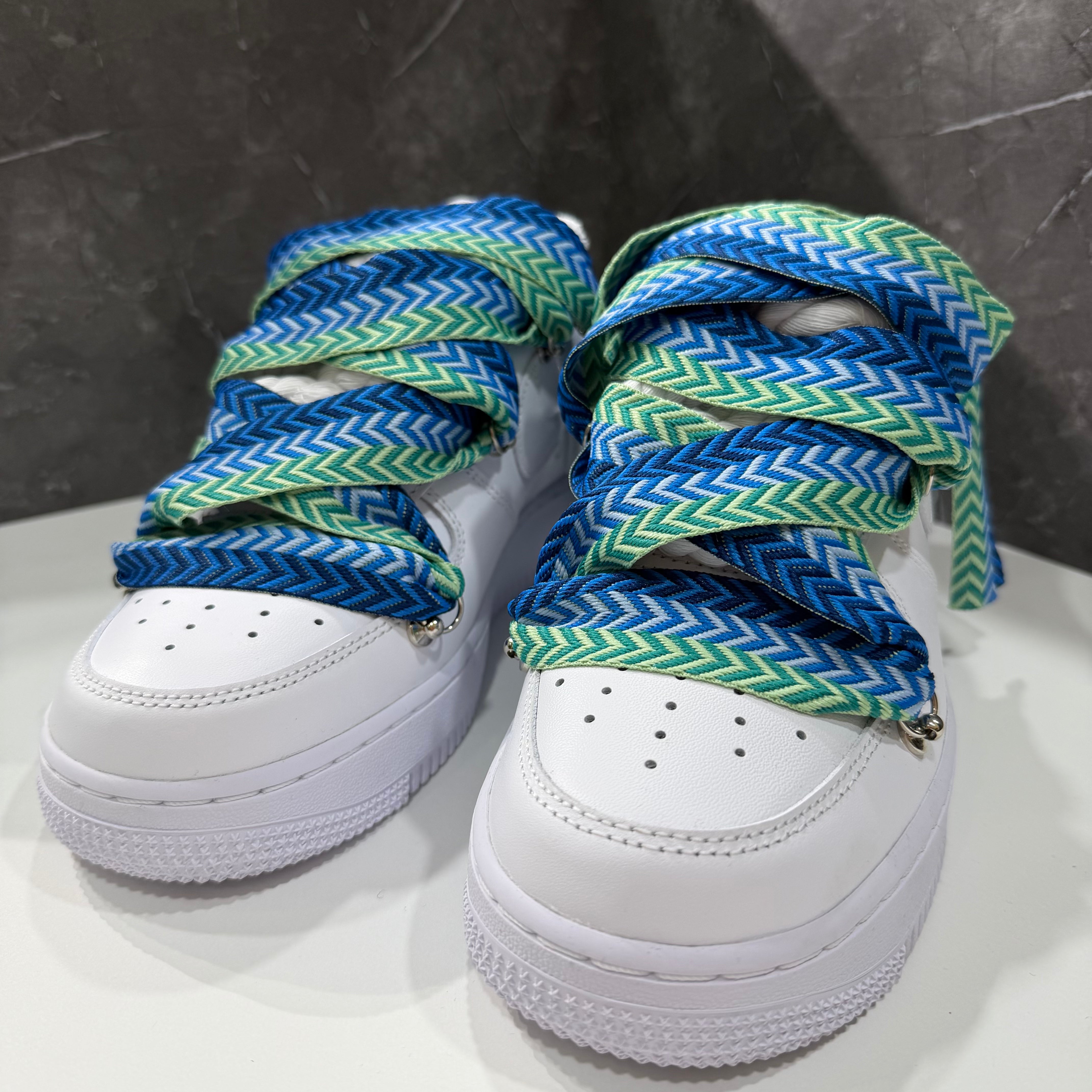 Su di essa abbiamo effettuato una custom, sostituendo i lacci comuni bianchi con corde intrecciate in cotone, rifinite con guaina termo restringente. Abbiamo applicato rivetti nei lati con anelletti per poter permettere il passaggio di un secondo laccio stile "Lanvin", in questo caso di color azzurro, rendendole cosi uniche e affascinanti.