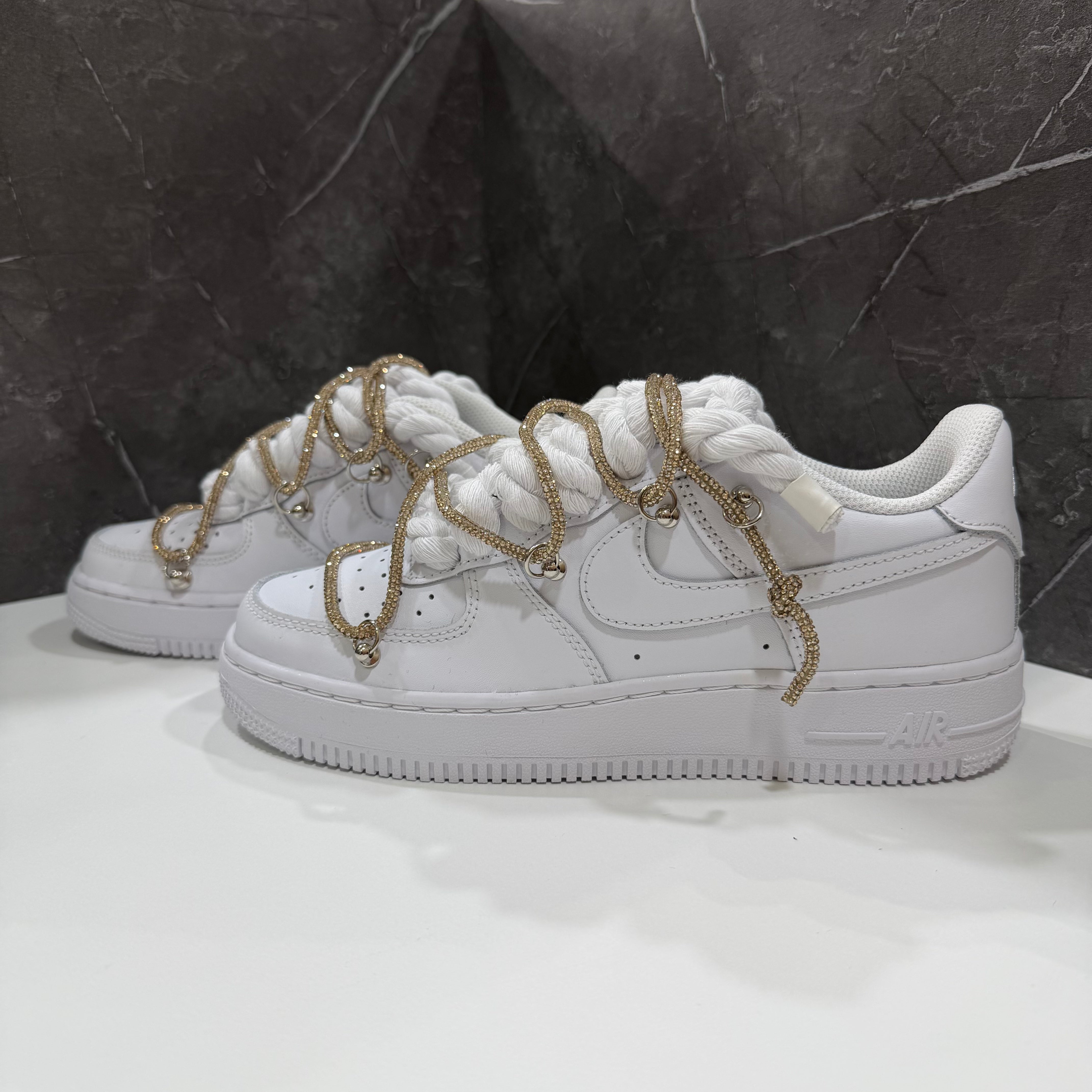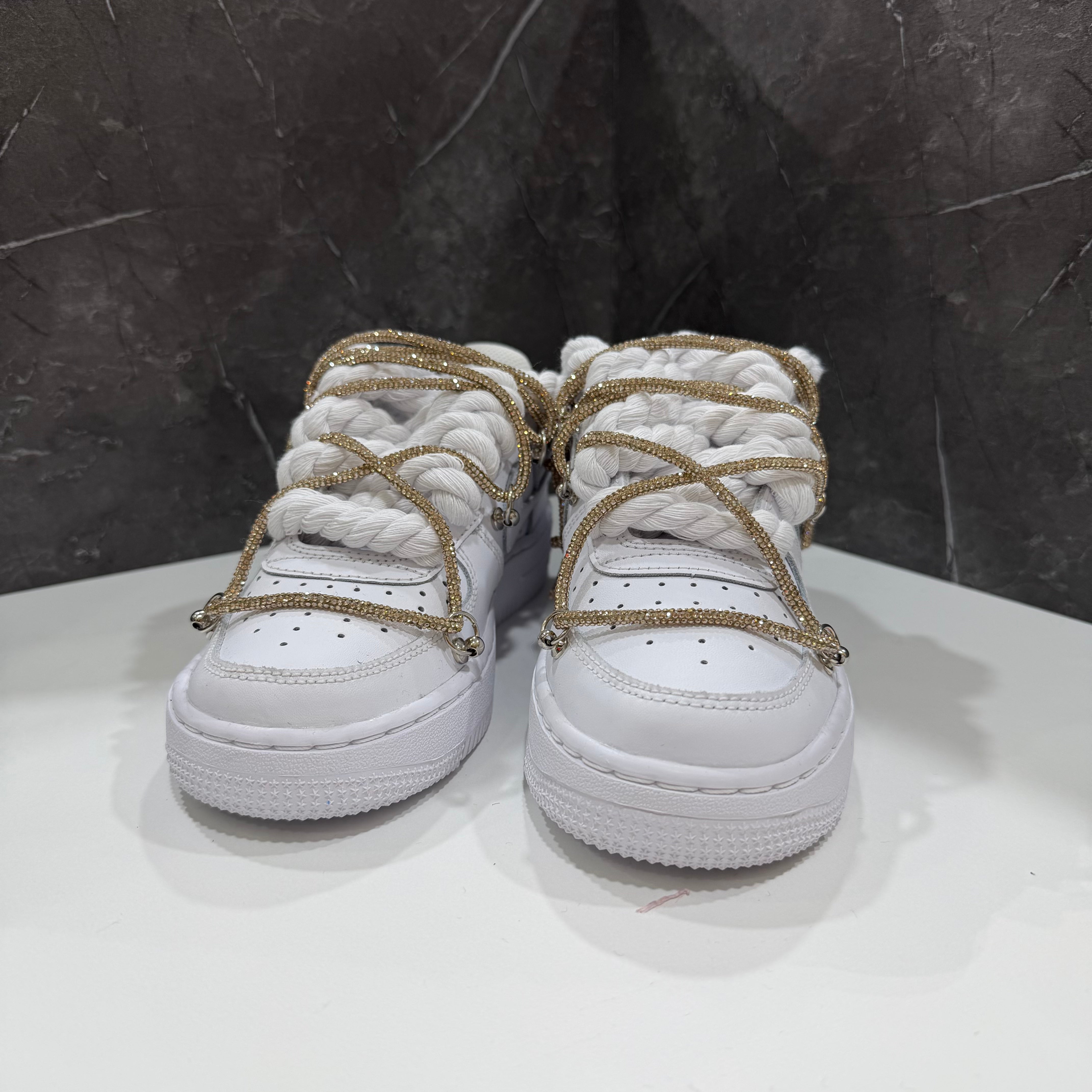 Su di essa abbiamo effettuato una custom, sostituendo i lacci comuni bianchi con corde intrecciate in cotone, rifinite con guaina termo restringente. Abbiamo applicato rivetti nei lati con anelletti per poter permettere il passaggio di un secondo laccio stile "Swarovsky" , in questo caso di color oro, rendendole cosi uniche e affascinanti.